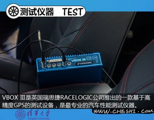 既然网上车市是全网最严谨的汽车垂直媒体,联合中国最高学府---清华大学来测试汽车,全国媒体圈中最专业的测试仪器必不可少。VBOX Ⅲ是英国瑞思捷RACELOGIC公司推出的一款基于高精度GPS的汽车测试设备,可以说是目前最专业的汽车性能测试仪器(可测试项目有加速性能/刹车/车速表偏差纠正)。由于采用了精度和采样速度都非常高的GPS系统,一套VBOX测试仪售价十几万元起,光是每次使用安装和拆卸均要超过半小时。而目前国内大部分汽车媒体进行加速制动测试所使用的DBOX或PBOX可以看作是VBOX的精简版,售价为几千元,精度方面差别巨大。