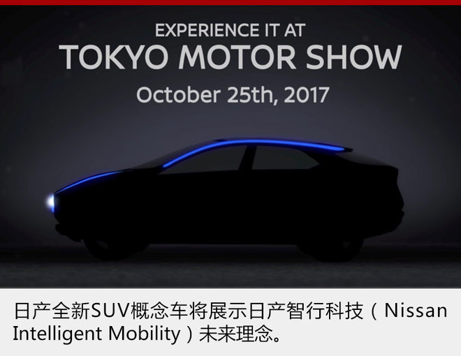 另一款概念车目前仅曝光了一张预告图。新车采用轿跑型SUV车身设计,头灯、发动机罩和车顶轮廓线有蓝色的投影照明,线条十分流畅,营造出溜背式设计。据日产官方表示,这款全新概念车将展示日产智行科技(Nissan Intelligent Mobility)未来理念,包括“智能驾驶”、“智能动力”和“智能集成”三大部分。未来,这款新车的量产版本有望加入聆风家族。(图/文 网通社 裴健如)