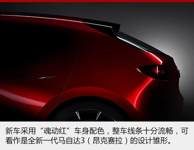 这款采用“魂动红”车身配色的全新概念车为一款五门掀背两厢车。从已经曝光的预告图来看,新车采用魂动设计语言,整车线条十分流畅,头灯和尾灯的设计保留了现款马自达3的部分设计元素,同时车顶线条与前后风挡玻璃流畅衔接,搭配上翘的黑色小尺寸扰流板,整体造型十分动感,可视作是全新一代马自达3(昂克赛拉)的设计雏形。