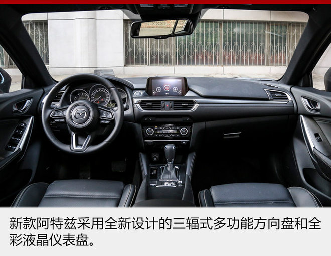 新款阿特兹提供黑/白两种内饰配色,并且换装纯黑色顶棚结合LED内饰氛围灯设计,采用全新设计的三辐式多功能方向盘、Nappa真皮座椅和全彩液晶仪表盘,进一步提升质感。与现款车型相比,新车的最大变化在于配置的进一步升级,GVC(加速度矢量控制系统)、胎压监测等功能成为全系标配,同时新车新增远近光自动切换和车道偏离预警系统,全面搭载i-ACTIVSENSE智能安全辅助系统,安全性进一步提升。