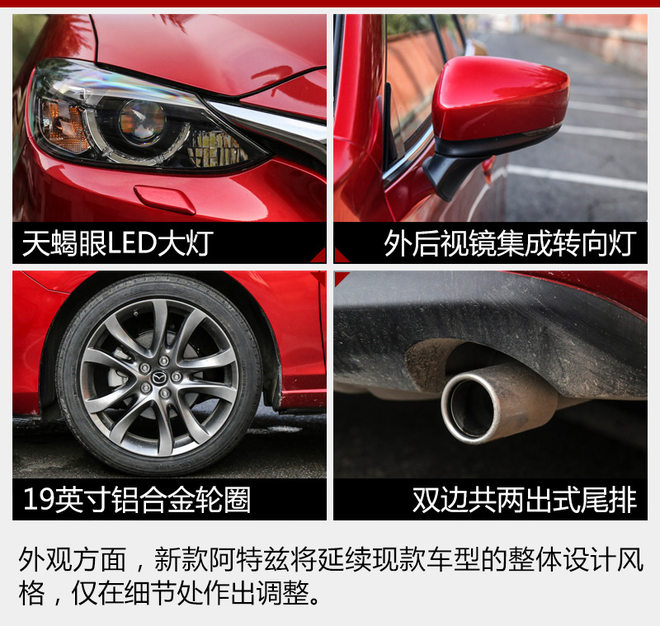 作为年度改款车型,新款阿特兹保留了现款车型的大体设计,并且对外后视镜等细节处稍作调整,外后视镜转向灯的长度有所增加。同时,新车还将全系标配外后视镜自动折叠功能。新款阿特兹采用马自达魂动设计语言,配备六边形镀铬进气格栅和天蝎眼LED大灯,结合19英寸铝合金轮圈和双边共两出式镀铬尾排,整体设计时尚动感。
