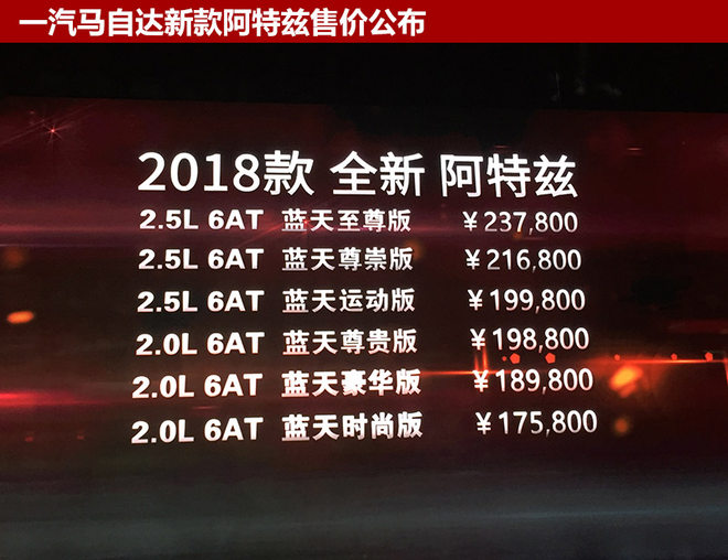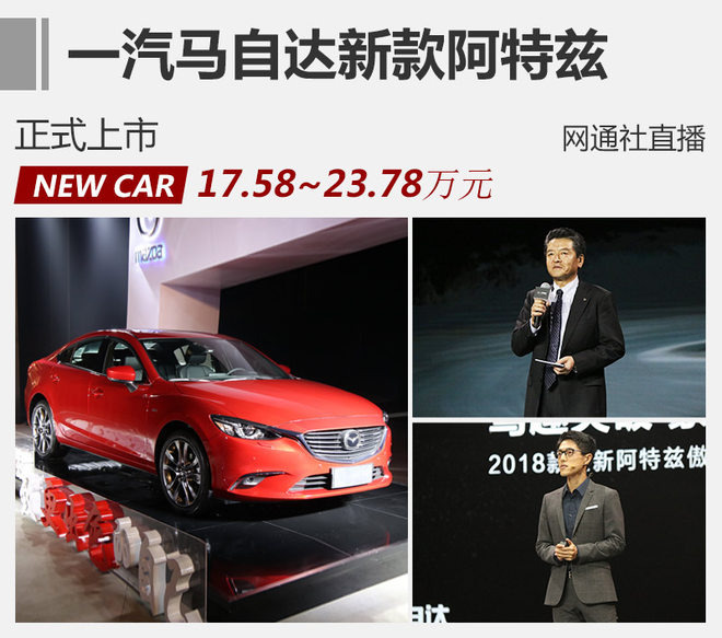 目前,一汽马自达旗下共有阿特兹和CX-4两款产品。继今年8月份新款CX-4上市之后,阿特兹也将迎来年度改款车型。相较现款车型,新车将在配置方面再度升级,进一步提升驾乘体验。网通社从一汽马自达官方获悉,新款阿特兹正式上市。新车推出2.0升和2.5升两种排量共6款车型,售价区间为17.58-23.78万元。