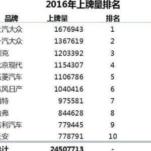 从我们2016年上牌量排名中中看到,2016年上汽大众、一汽大众累计上牌3044562辆,分别占总上牌量的7%、6%,稳居行业排名第一、第二位。