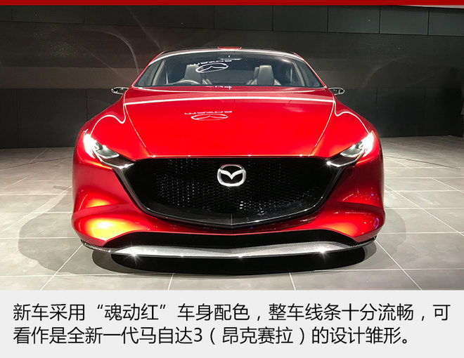 这款采用“魂动红”车身配色的全新概念车为一款五门掀背两厢车。从已经曝光的预告图来看,新车采用魂动设计语言,整车线条十分流畅,头灯和尾灯的设计保留了现款马自达3的部分设计元素,同时车顶线条与前后风挡玻璃流畅衔接,搭配上翘的黑色小尺寸扰流板,整体造型十分动感,可视作是全新一代马自达3(昂克赛拉)的设计雏形。