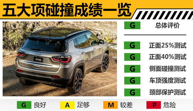 指南者是Jeep旗下紧凑型SUV,目前由广汽菲克进行国产销售。网通社从美国高速公路安全保险协会(IIHS)获悉:2017款美版指南者在该机构进行了碰撞测试,新车的全部5大项考核成绩均拿到最高分,在碰撞中可为车内乘员提供充分的防护,并摘得“2017 最高等级安全评定”称号。