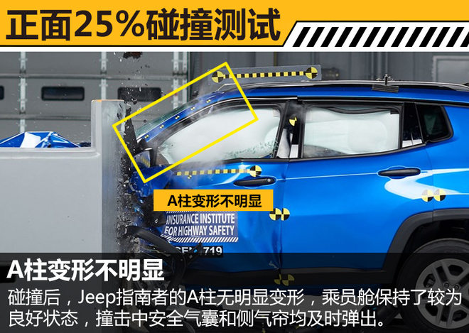 本次公布成绩的车型为美版2017款Jeep指南者。IIHS的碰撞测试项目共分为正面25%碰撞、正面40%碰撞、侧面碰撞、顶部碰撞和颈部保护5大项,指南者各项成绩均拿到最高分。