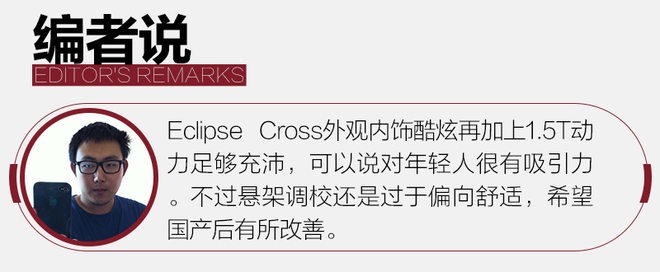 从实际驾驶来看,我认为Eclipse Cross在此级别处在中上水平,对于车主日常的城市驾驶来看,这款车还是足够满足大部分人的需求,再配合酷炫的外观,可谓很有竞争力。