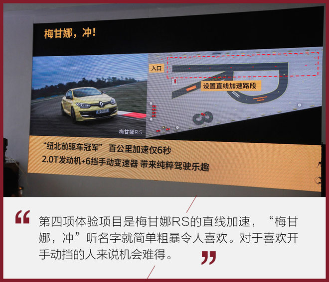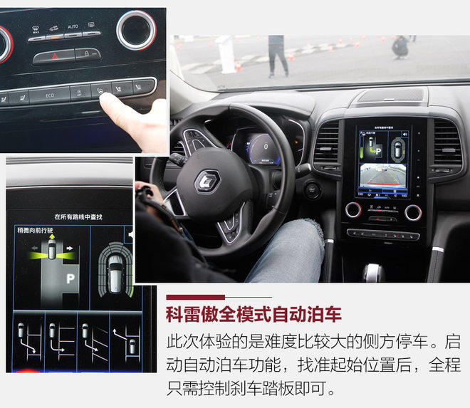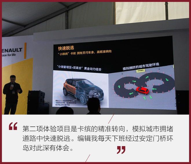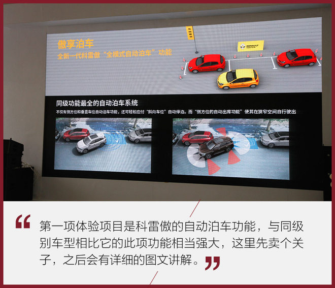 在非常简短的开幕式致辞后,直奔专业的体验讲解。本次活动一共有4项与车辆性能、功能密切相关的体验,分别是科雷傲的“全模式自动泊车”功能、科雷嘉的复杂路况驾驶、卡缤的转向和梅甘娜RS的直线加速。