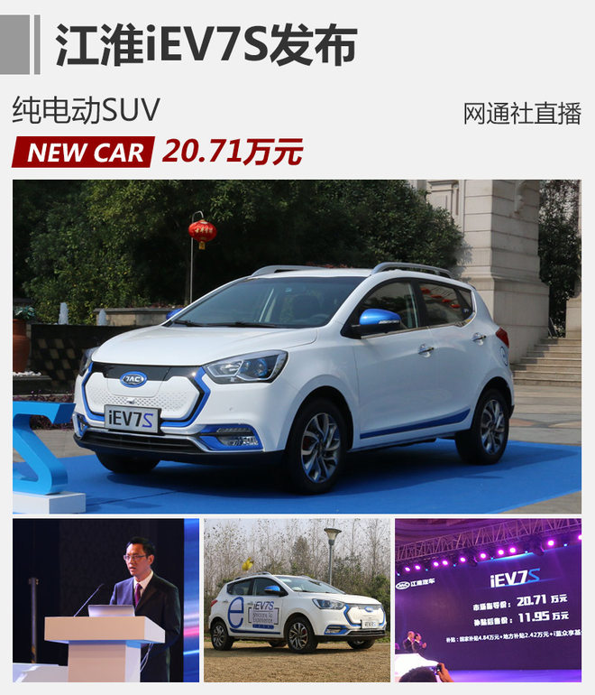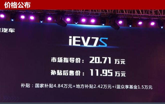 江淮新能源凭借在售的iEV4、iEV6E、iEV7等车型,实现了今年1-9月累计销售1.8万辆新车的成绩。根据企业小规模迭代的规划,企业还将不断推出新车型,提高产品的竞争力。网通社从江淮新能源官方获悉,iEV7S正式发布,售价为20.71万元,经过多重补贴后售价为11.95万元。新车可以看作是iEV6S车型的改款升级版本,定位为一款小型纯电动SUV,其NEDC工况续航里程为280公里。