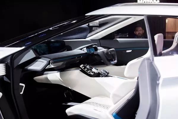 内饰上,概念车的设计一样是突出未来感,环抱式的设计风格,采用深灰色与白色的撞色搭配并加以蓝色元素进行点缀,还配备液晶仪表以及由三块大尺寸液晶显示屏组成的中控屏,可以根据用户的选择来显示不同的内容。