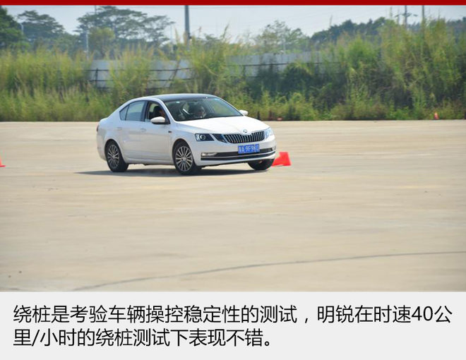 绕桩可以考验车辆在交替变线时的稳定性,这项测试可以测试车辆的变线极限速度、车身稳定系统介入情况、悬挂的支撑效果和转向调校效果。明锐本身的定位就是家用车,所以在众多的调校都是偏向于舒适性与家用的。极限速度方面,职业教练可以将车子开到60公里/小时,但是小编能力有限,只能将车子开到40公里/小时;车身稳定系统方面,在车辆即将失控的时候,车身稳定系统及时介入,让车身不失控打滑;悬挂支撑方面,明锐采用前麦弗逊后扭力梁式的悬挂,所以在极限变道的时候处于内侧的车轮会受到一些外侧轮胎的影响,侧倾的抑制不是很明显;转向方面,我个人觉得调校比较适中,不轻也不重。