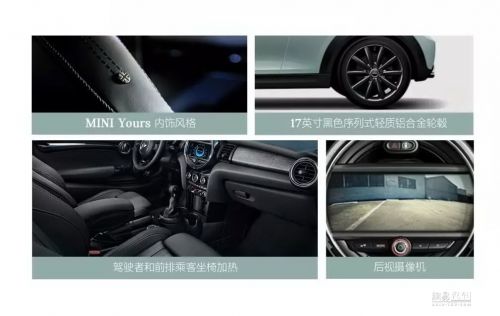 MINI COOPER三门版及五门版冰蓝限量款车型各发售100台,其主要特点是采用了冰川蓝配色的车漆。在配置部分,新车配备了智能无钥匙启动、哈曼卡顿高保真音响系统、MINI Yours内饰、17英寸黑色序列式铝合金轮圈、前排座椅加热以及倒车影像等。
