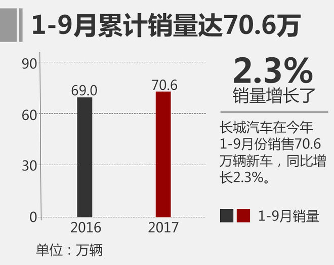 此前长城汽车公布的销量数据显示,风骏皮卡累计销售8.4万辆,同比增长11.6%;哈弗品牌SUV销量为58.4万辆,同比微降1.0%;上市不久的WEY品牌累计销量已超2.8万辆,更是凭借VV5和VV7两款车,在9月单月销量突破万台。长城汽车1-9月累计销售70.6万辆,同比微增2.25%。