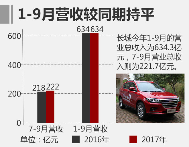 长城汽车在9月实现销售10.2万辆新车,1-9月的累计销量达70.6万辆,其中新推出的轻奢品牌WEY更是首次实现了单月销量超过1万台。网通社从长城汽车官方获得了其第三季度财报,文件显示企业今年1-9月的营业总收入为634.3亿元,与去年同期持平,其中7-9月实现营业总收入221.7亿元,同比微增1.8%。