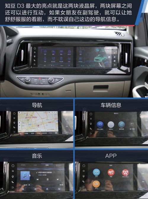 知豆D3的内饰设计比较简洁,两块大屏幕最为抢眼,女朋友只能在副驾驶玩手机?可能在D3上有了质的变化,副驾驶专属的不再是遮阳板上的小化妆镜,而是一个九英寸大屏幕,不仅可以玩里面的娱乐应用,贴心的小女朋友还可以帮你设置导航,实现了双屏幕的互动。