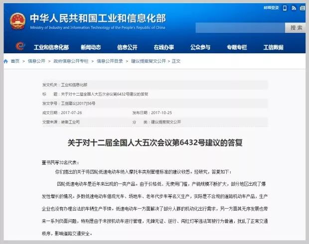 2017年10月26日,工信部公布了《关于对十二届全国人大五次会议第6432号建议的答复》(下称《答复》),就9月份全国人大代表提出的“将四轮低速电动车纳入摩托车类别管理标准”给出明确回复。