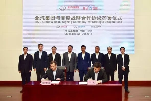 2017年10月13日,北汽集团与百度在北京汽车产业研发基地签署战略合作框架协议,在汽车智能化领域达成集团层面的战略合作。此次合作涉及到自动驾驶、智能车联、云服务、自动驾驶汽车测试等。百度将以Apollo开发平台为基础与北汽集团车辆平台协作,北汽借助百度人工智能核心技术,计划在2019年左右推出L3级自动驾驶车辆,到2021年前后还将实现L4级自动驾驶。