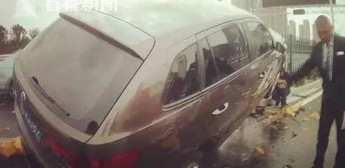现场可以看出,这辆棕色轿车把路上的十多个隔离桩撞得粉碎,直到骑上快速路上的栅栏,才停了下来,车头高高翘起,距离地面足有一个人高。
