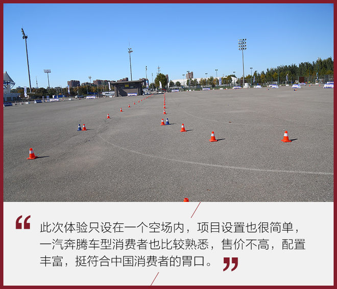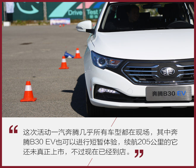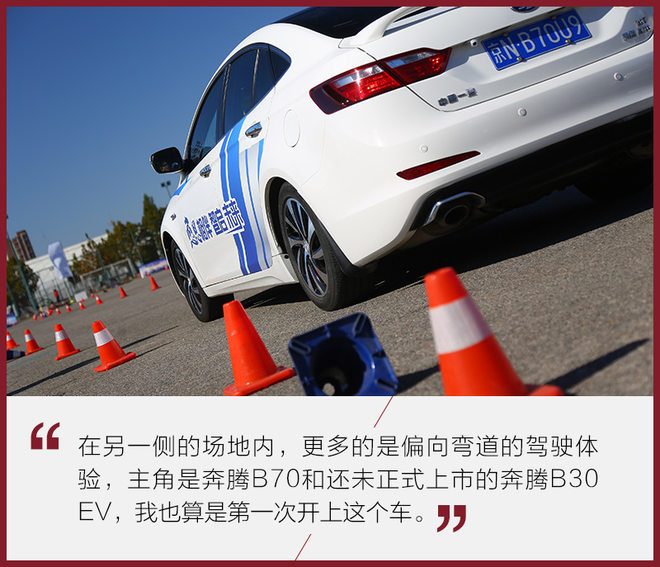 在场地的另一侧,主要考验的是车辆在弯道中的性能,这次的主角是奔腾B70以及B30 EV。两台车动力完全不同,其驾驶感受也有天壤之别,B30 EV由于电动机起步便能释放最大扭矩的特性,在初始加速时的提速给人感受最为强烈。但在弯道时如果你不小心控制车速,推头就不可避免。