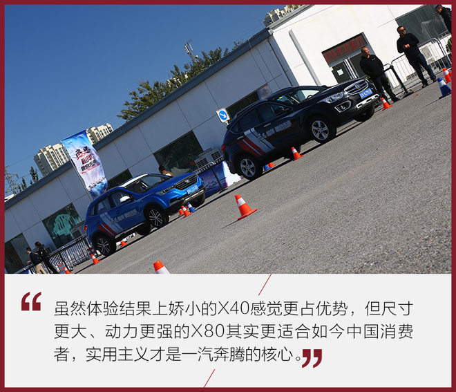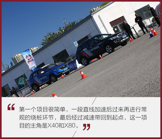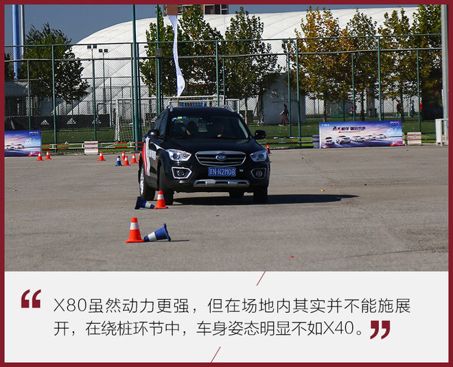 在第一个环节当中,X40的实际表现要由于X80,这主要因为场地比较小,身材更加娇小X60更加灵活。1.6L自然吸气发动机也比动力更强的X80好控制,如果这要放在实际道路可能是另一个结果。但无论如何,每个产品都有每个产品的特性,都有其特定人群。