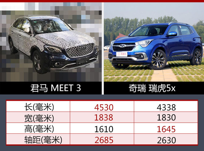 根据数据显示,君马MEET 3长宽高分别达到4530*1838*1610毫米,轴距达到2685毫米;与同级别车型奇瑞瑞虎5x相比,新车除高度方面略低于后者,长度、宽度以及轴距均占有优势。