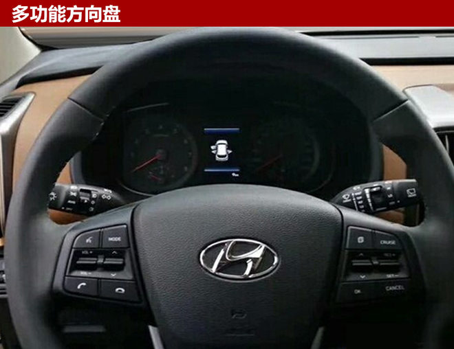 现代全新ix35采用黑/棕双色搭配设计,三辐式多功能方向盘前方为双圆盘指针仪表,且中间带有彩色显示屏。该车中控区域层次丰富,并采用大面积棕色软质材料进行包裹;中间区域配有大尺寸液晶显示屏,底部带有物理按键,两侧为空调出风口;空调控制旋钮设计在屏幕下方,底部带有镀铬装饰进行点缀。配置方面,全新ix35配有自动大灯、蓝牙电话、一键启动、自动空调等丰富配置。