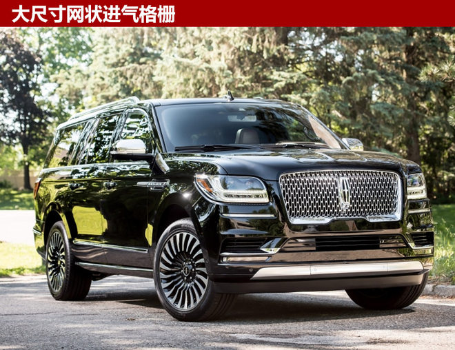 全新林肯领航员前脸换装大面积网状进气格栅,中间镶嵌林肯品牌LOGO,整体更显豪华。两侧大灯组采用全LED光源,配以下方双“L”造型日间行车灯,点亮效果十分醒目。下方格栅采用横幅样式,两侧雾灯使用LED光源,配合底部银色护板,十分霸气。
