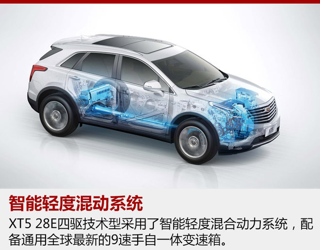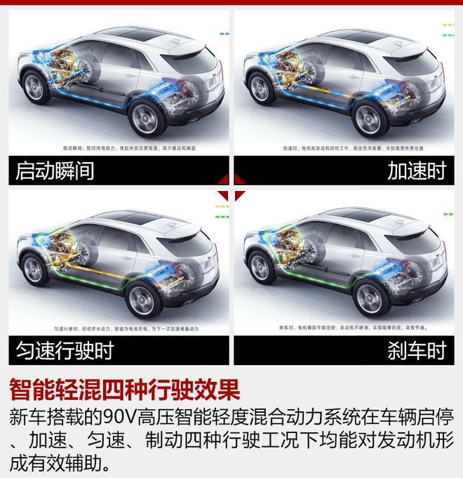 凯迪拉克XT5 28E四驱技术型搭载的90V高压智能轻度混合动力系统在车辆启停、加速、匀速、制动四种行驶工况下均能对发动机形成有效辅助,并且加入的制动能量回收系统。