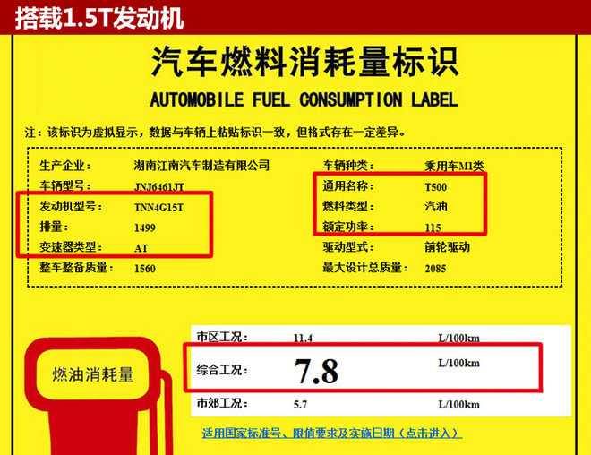 从国家工信部公布的信息可知,T500将搭载型号为TNN4G15T的1.5升涡轮增压发动机以及型号为TNN4G16A的1.6升自然吸发动机,额定功率分别为115千瓦和85千瓦,百公里综合油耗分别为7.8升和7.3升。