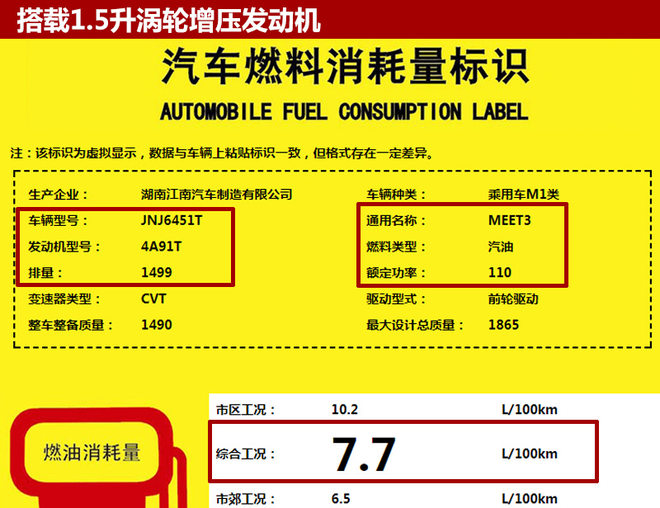 从国家工信部公布的信息可知,君马MEET3将搭载一台型号为4A91T 1.5升涡轮增压发动机,额定功率110千瓦,百公里综合油耗7.7升;传动系统方面,与发动机匹配的是CVT变速箱。