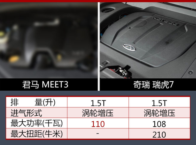 同级别车型中,奇瑞瑞虎7同样搭载一台1.5升涡轮增压发动机,最大功率为108千瓦;通过对比后发现,君马MEET3所搭载的1.5升涡轮增压发动机在数据输出方面占有优势。
