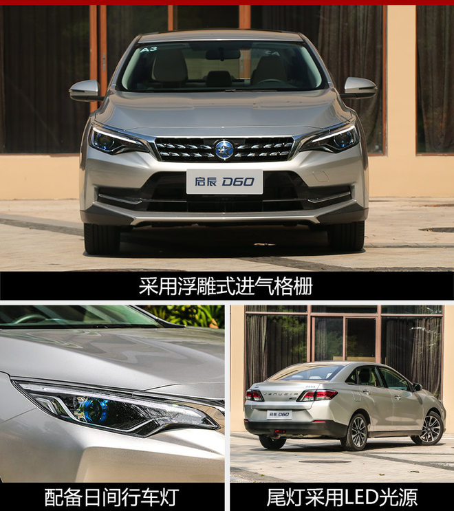 启辰D60的长宽高分别为4,756*1,803*1,487毫米,轴距为2,700毫米。外观方面延续了家族样式的“风雕美学”设计语言,品牌LOGO置于格栅中央。同时,新车配备了细长形远近光一体式头灯,内部集成LED日间行车灯,搭配17英寸多辐式合金轮圈和LED尾灯,整体造型更加动感。