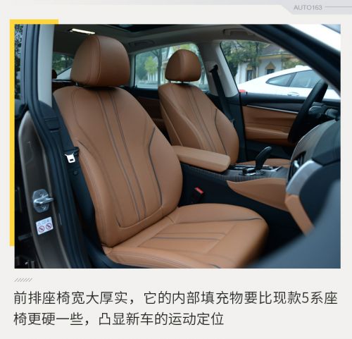 6系GT的前排座椅宽大厚实,它的内部填充物要比现款5系座椅更硬一些,凸显新车的运动定位。另外,新车的坐姿要明显比一般轿车更高,所以坐在前排的驾驶视线很棒。