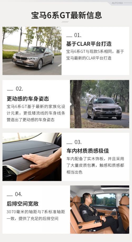 创新BMW 6系GT是宝马首次将GT车型概念嫁接在以性能和美学著称的6系上。它是5系GT的继任者,与现款7系和5系相同,都基于宝马最新的CLAR平台打造。
