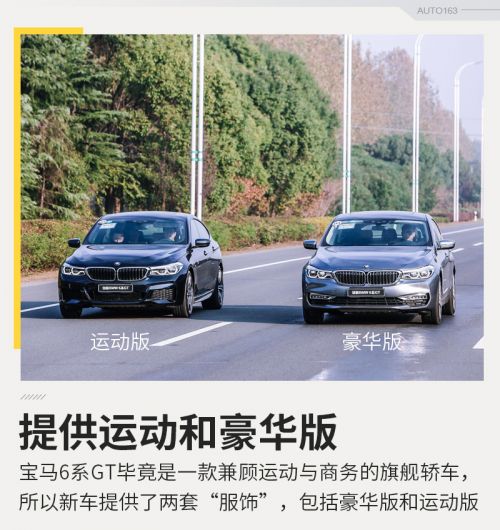 宝马6系GT毕竟是一款兼顾运动与商务的GT轿跑车,所以新车提供了两套“服饰”,包括豪华型和M运动型,从而兼顾不同消费者的需求。