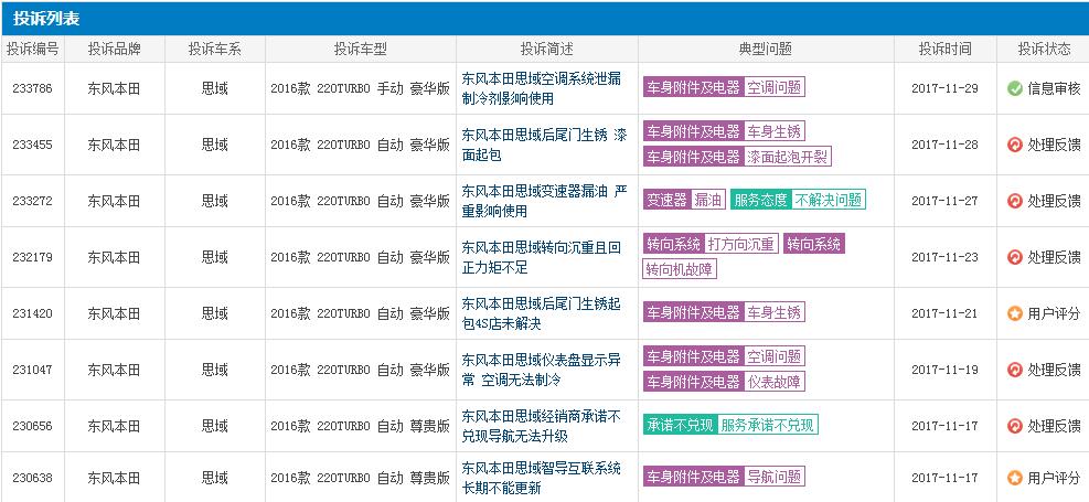 根据网上的投诉平台来看,目前十代思域车主的主要投诉集中在这三个方面: