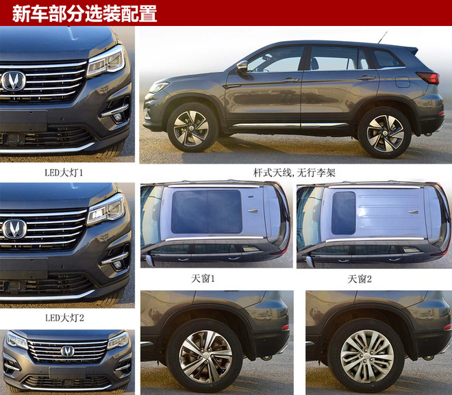 配置方面,新车可选装前排侧安全气囊、前后排一体式侧安全气帘、 LED大灯、前雾灯、天窗、行李架、杆式天线、轮圈等。