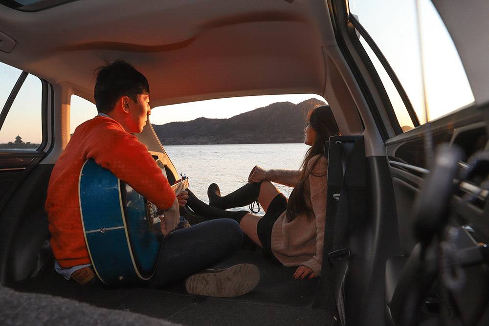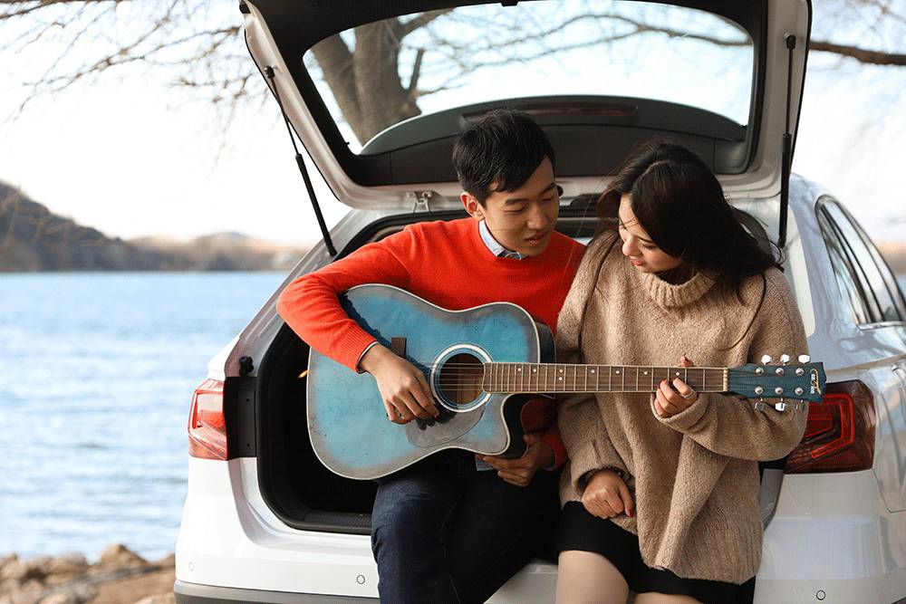 旅行车的优势在于两个人都能坐在后备箱内,面朝宽广的湖面,心里也能春暖花开。这种感觉往往能带给我创造的灵感,我喜欢唱给她听,吉他能够代替我无法用语言表达的情感,这是我与她最享受的时光。