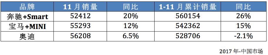 在中国市场,11月份奥迪上涨了6.5%,以56208辆的销量排名第一;宝马(含MINI)销量上涨了12%,达到55293辆;奔驰(含Smart)销量为52412辆,增幅达到20%。