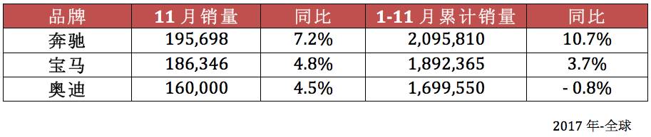 虽然奥迪在11月超越了竞争对手,不过依然无缘2017年的中国豪华车市冠亚军之争。从前11个月累计销量来看,奔驰增长了26%至560154辆,宝马增长了15%至542362辆,奥迪下降了2.1%至528706辆。