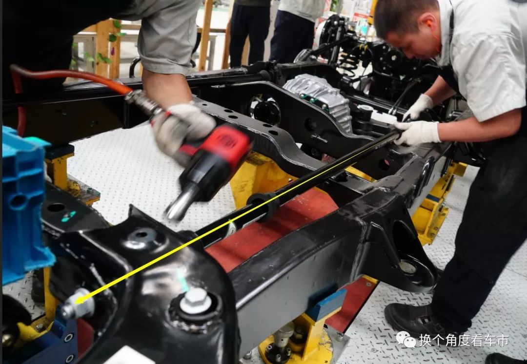 上图为BJ80军用版合装线,安装并调试扭杆弹簧工序。BJ80军用版的适配扭杆弹簧,需要多位熟练技工协同合作装配并调试到合适姿态。