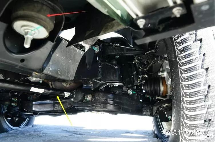 白色箭头:扭杆弹簧贯穿前下A型摆臂,可以调整弹簧阻尼系数甚至前悬架高度