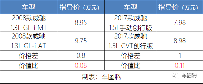 十年后,2017款威驰1.5L手动创行版指导价为7.98万元,1.5L CVT创行版指导价为8.98万元,二者价差反而拉大到了1万元。