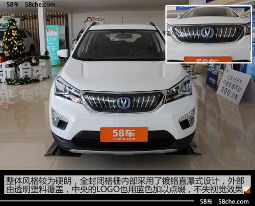 该款车型是基于传统汽车长安CS15打造,外形比较成熟,整个中网与左右大灯相连,看起来十分细长,采用全新的封闭式进气格式,中间镶嵌的全新LOGO,点缀大量的蓝色,象征新能源汽车的标志颜色。