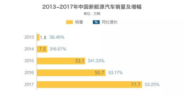 数据显示,2017年我国新能源汽车产量79.4万辆,销量77.7万辆,产量占比达到了汽车总产量的2.7%,连续三年居世界首位。个人汽车消费市场正在快速兴起,新能源乘用车去年销售的占比接近75%。