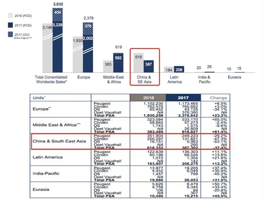 2017年,PSA集团全球年销量达363.2万辆,同比增长15.4%,全球多个地区都实现了增长,中东和非洲市场增速甚至超过了60%,但是在中国和东南亚市场却遭遇了“断崖式”下跌。这也直接导致了担任中国及东南亚区域总裁的马德宁(Denis Martin)“被下课”。
