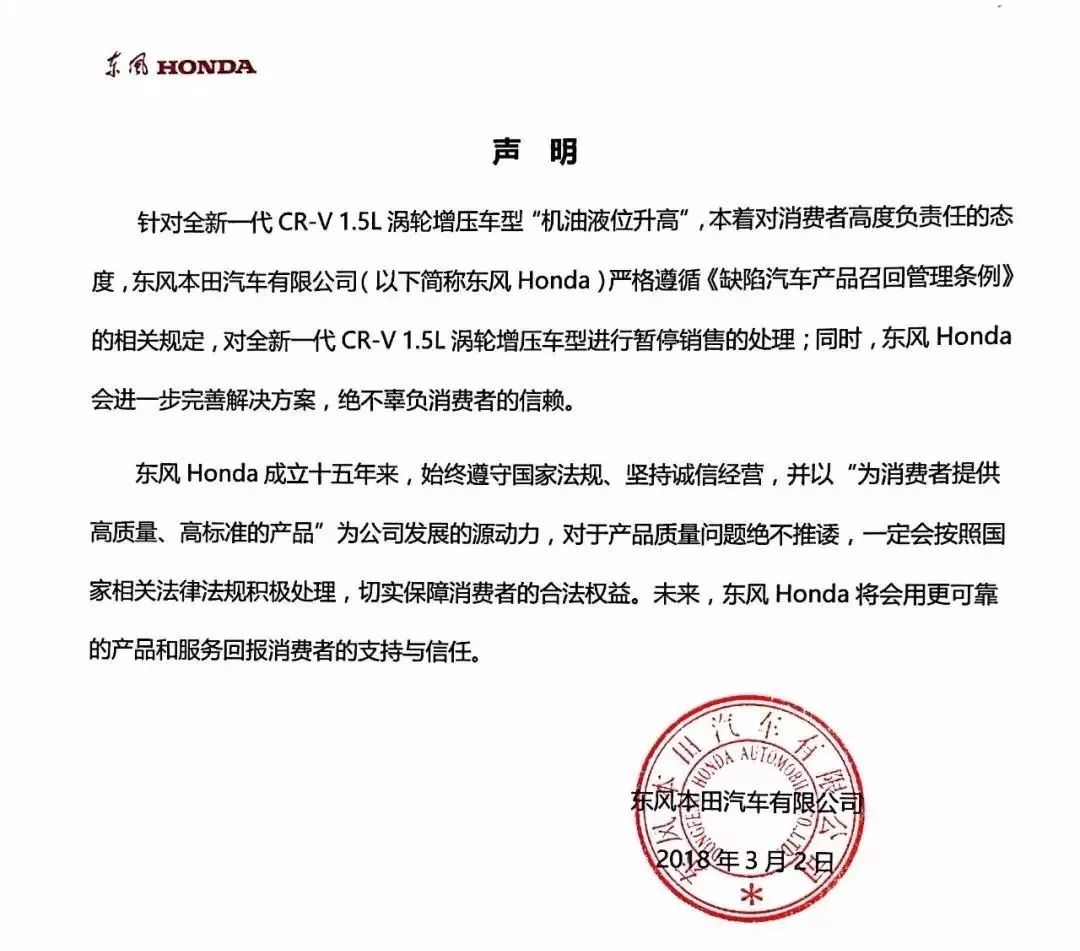然后在3月2日上午东本官方就发布声明,确认了新CR-V的1.5T车型将暂时停止销售。