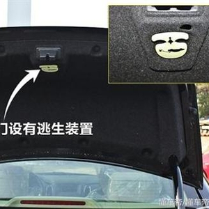 现在有不少车内有后备箱逃生装置,有的是拉环状,有的是凹槽内的半月型开关,有的则需要用钥匙或尖锐硬物撬下后备箱箱锁芯堵盖,找到逃生开关,拉动或扳动此开关即可从内部打开后备箱,如果落水或被绑架,这无疑就是一条逃生暗道。