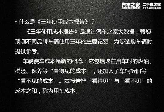 车辆使用成本概念:除了包括用户在使用时对燃油、税、保险、保养等项目所支付的“看得见的费用”外,车辆使用成本还纳入了“看不见的成本”,如折旧费用。(就比如您10万元买了一辆车,使用三年后二手车行情定位在6万元,这中间的4万元便是您看不见的折旧费用)因此,三年使用成本就是将用户购车后三年内“看得见”与“看不见”的成本相叠加计算出的总花销。