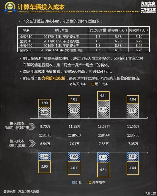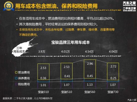本文涉及到的具体车型包宝骏310、宝骏510、宝骏560、宝骏730,级别涵盖小型车、小型SUV、紧凑型SUV、MPV四个不同级别,销量表现在各级别中也是非常出色的,具有一定的代表性。单从用车成本上看,宝骏560的支出最高,达到了4.54万元,同时其购买成本也在四款车型中最高,达到9.09万元,合计13.63万元。这是基于用户拥车三年后并不打算卖车的情况下测算得出。